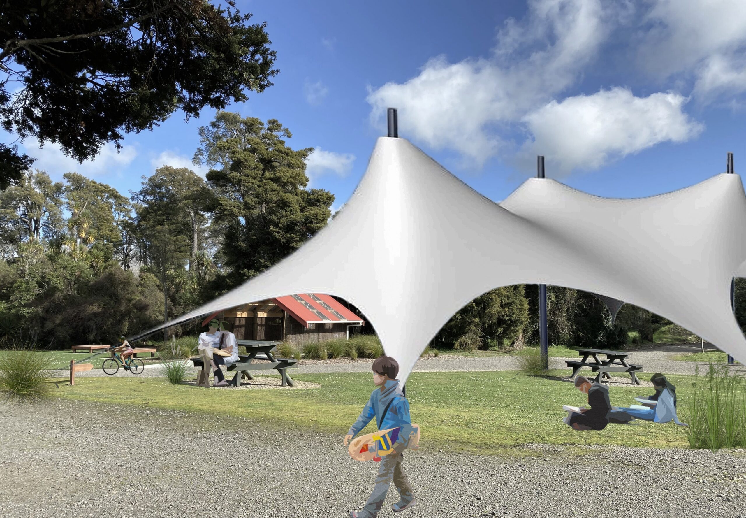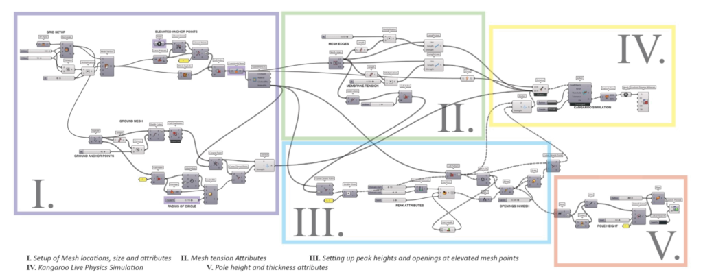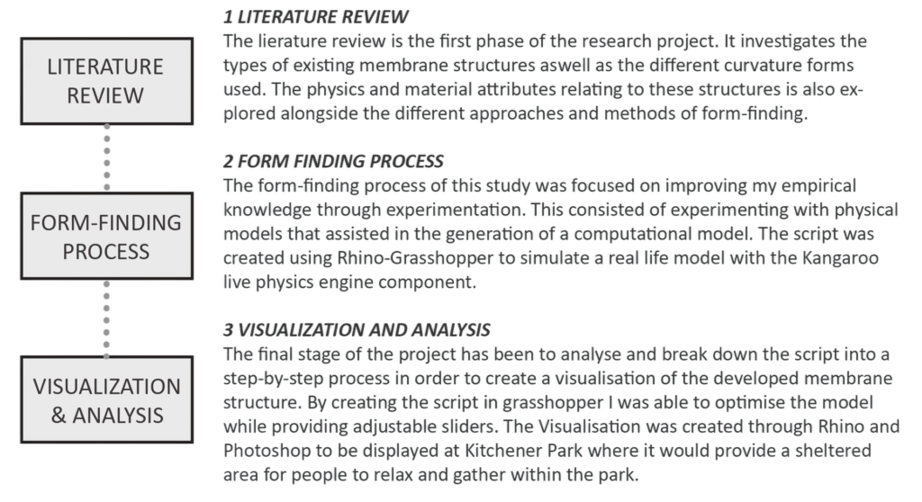 The primary model has been designed using a Grasshopper pluggin to simulate a real-life tensile structure visually through Rhino. The script follows a 9 step-by-step process which can be adjustable to the user and optimised to suit the structures location and intended purpose. Finally a visual representation of a Light-weight membrane structure is presented as a sheltering structure for a local park within the Manawatu District.